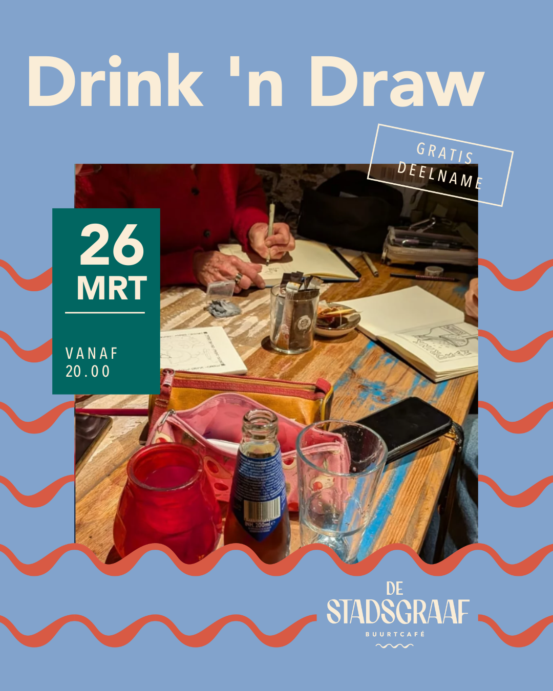 Neem je spullen mee en sluit aan. Entree is gratis, maar we verwachten wel dat je wat te drinken koopt.